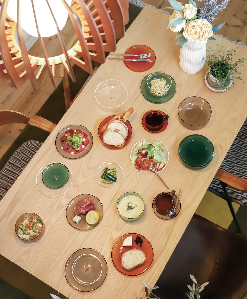 新作のプレート・ボウルはホウケイ酸ガラスの機能面を全面的に演出。
