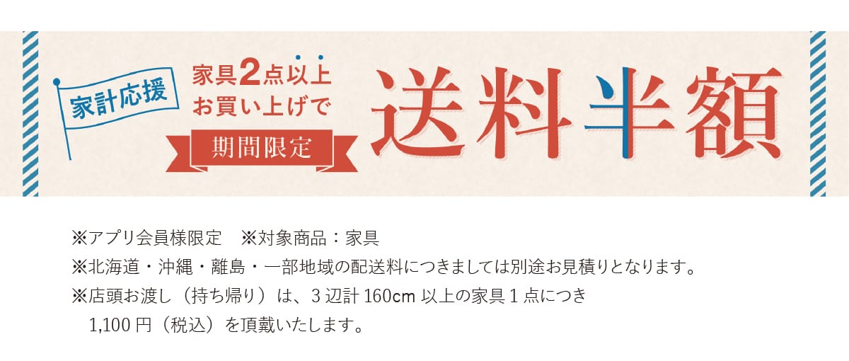 そこでa.depecheでは、家具2点以上のお買い上げで配送料・開梱設置が合計送料の半額となる、