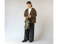 深めのVネックジャケットには、タートルネックや立ち襟のブラウスのレイヤードがおすすめです。