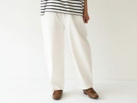 裾にダーツの入った綿麻デニムパンツで、足首をすっきりとみせます。