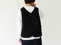 カーブの効いたボタン止めがアクセントの変形ベスト。
