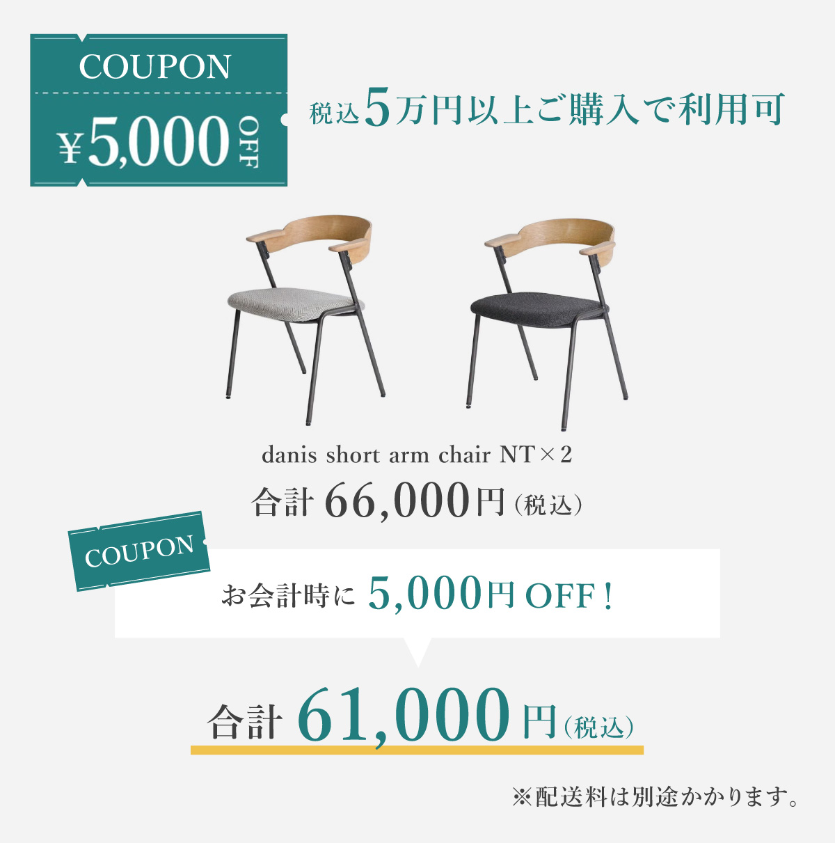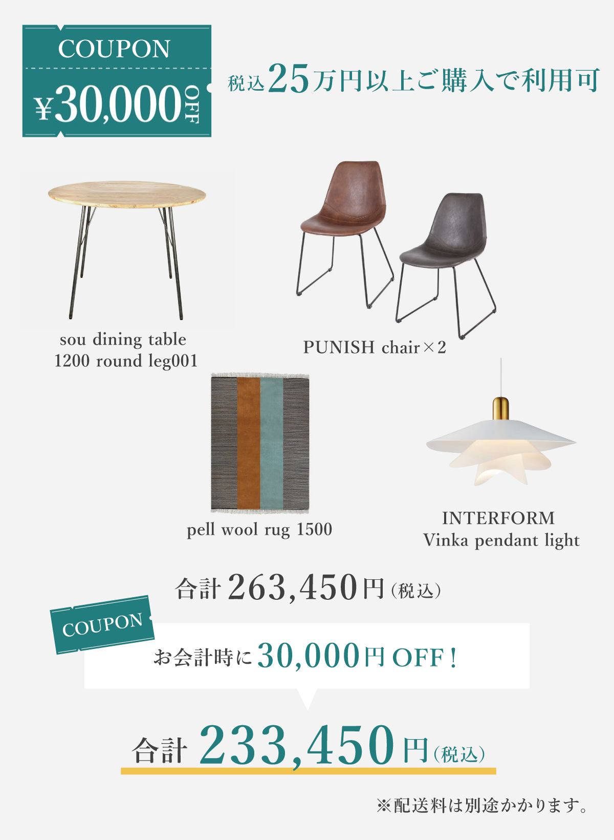 - 対象の家具・照明・ラグをご購入でクーポンキャンペーンの対象となります。