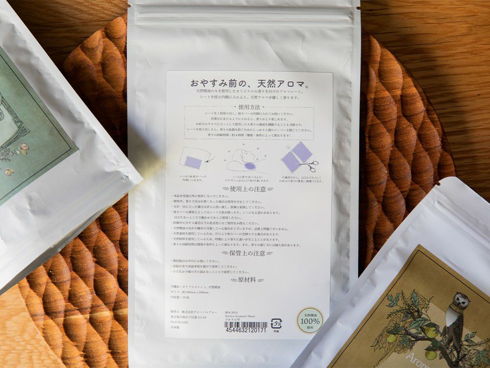 天然精油のみを使用しオリジナルの香りを付けたシートは、枕の内側に挟むだけなので簡単にアロマを楽しむことができます。