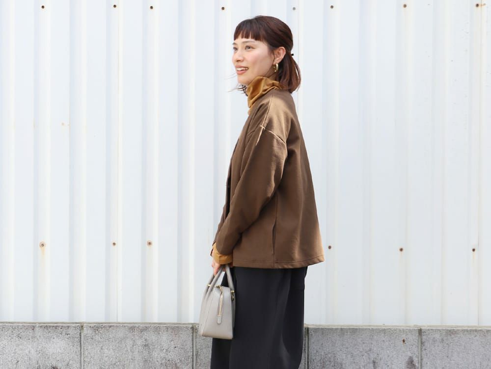 深めのVネックジャケットには、タートルネックや立ち襟のブラウスのレイヤードがおすすめです。