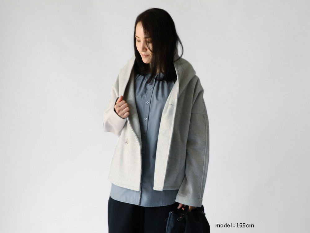 後ろ身頃のステッチが全体にメリハリを出し、切り替えのないフードがカジュアルにも綺麗めにも見せてくれる万能アイテムです。