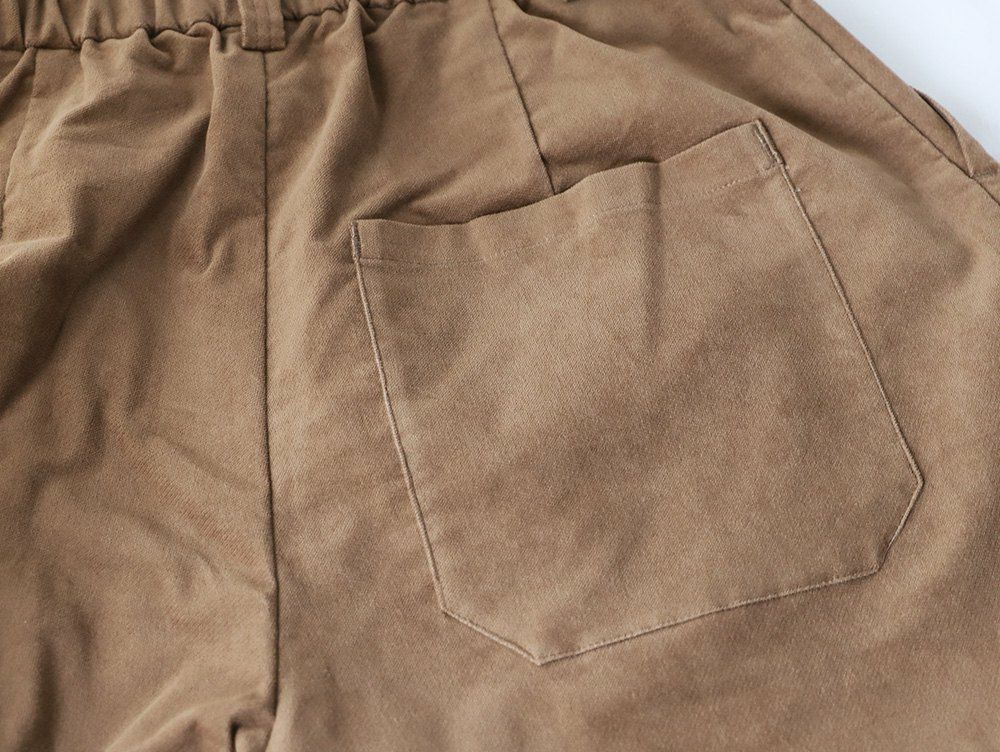ハイウエストで着用できるように後ろはゴム、ベルトループも付属しております。