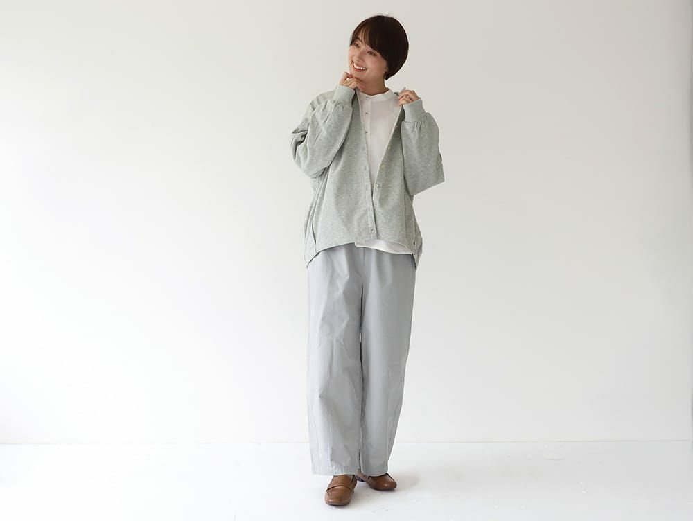 ボトムスは縦ラインのあるスリムなものにすることで華奢見え効果も。