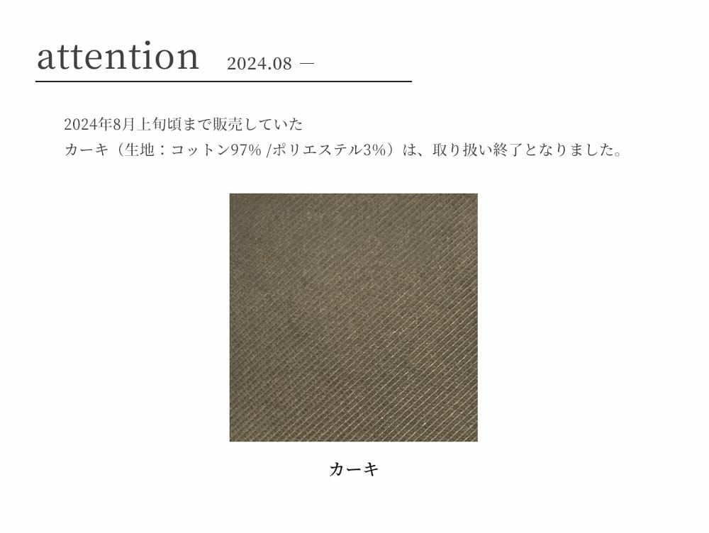 ※2024年8月初旬頃まで販売していたカーキ(生地:コットン97% /ポリエステル3%)は、取り扱い終了となりました。