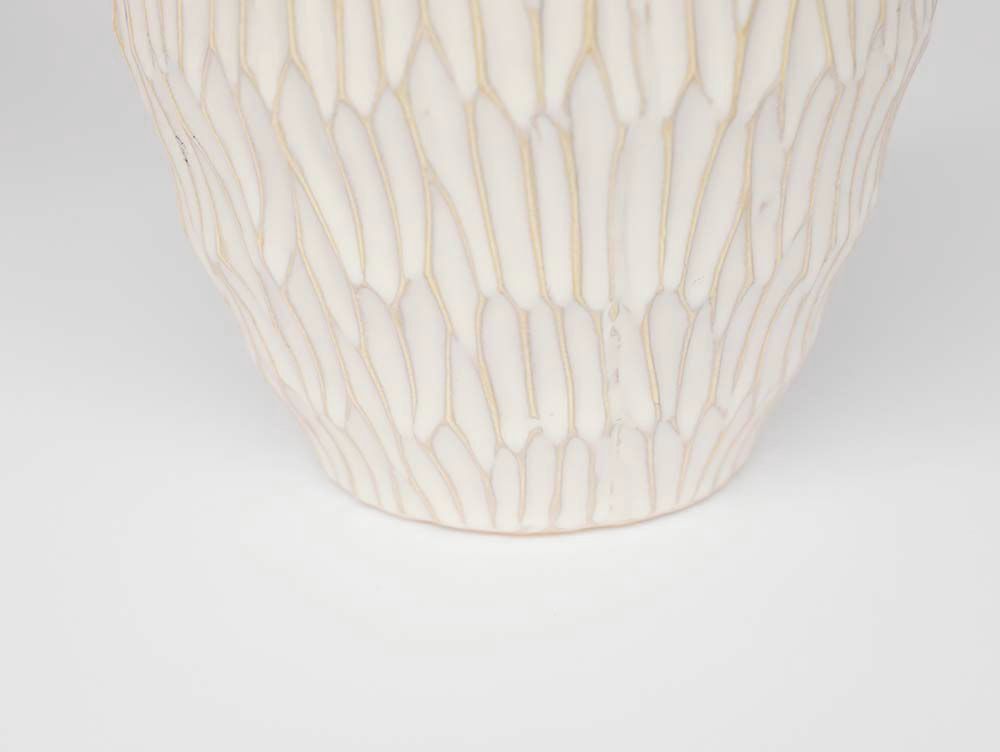 形状はシンプルな壺型ですが、彫り出したような表情を全面に施すことで、飽きのこないデザインに仕上げました。