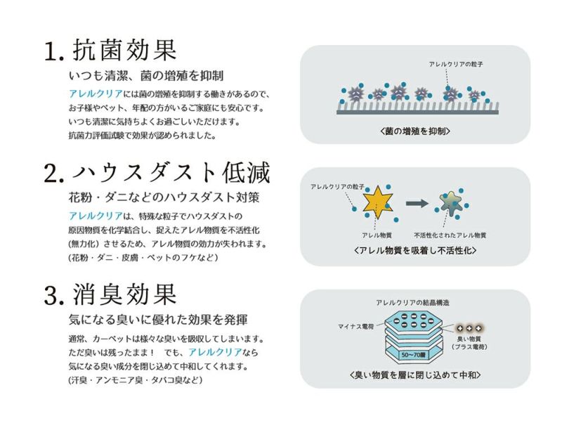 花粉・ダニなどのハウスダストの原因物質を化学結合し不活性化します。