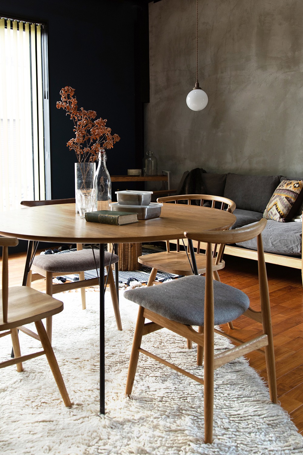 丸いダイニングテーブルに、丸みのあるデザインのチェアが、 空間を柔らかな印象にしてくれます。