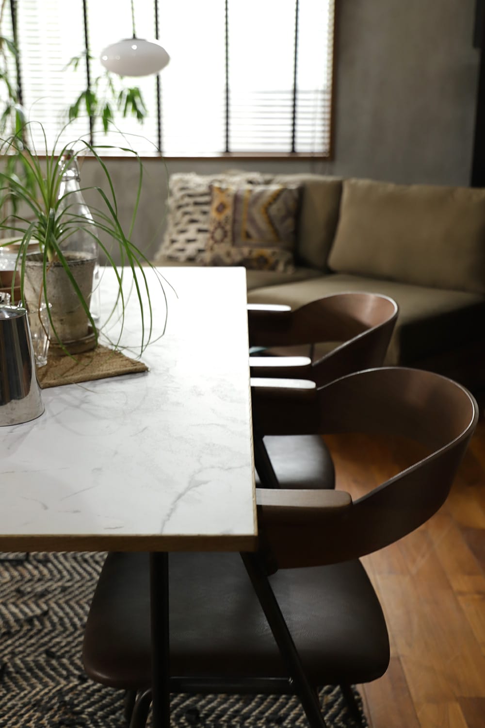 ダイニングテーブルの天板を大理石調にすることで、男らしすぎない、どこか柔らかで、モダンな空間にしてくれます。