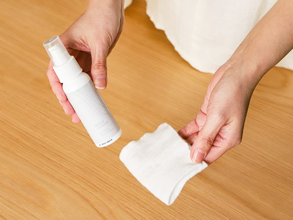 ウッドポリッシュのボトルをよく振り、ソフトクロスにウッドポリッシュを2プッシュ程度含ませます。