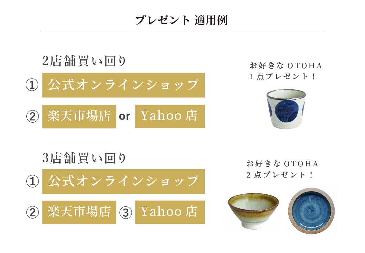 - ※公式オンラインショップを含む2店舗での買い回りでプレゼント1点、3店舗でプレゼント2点をお選びいただけます。