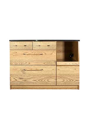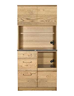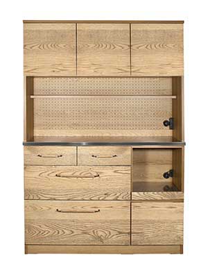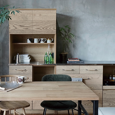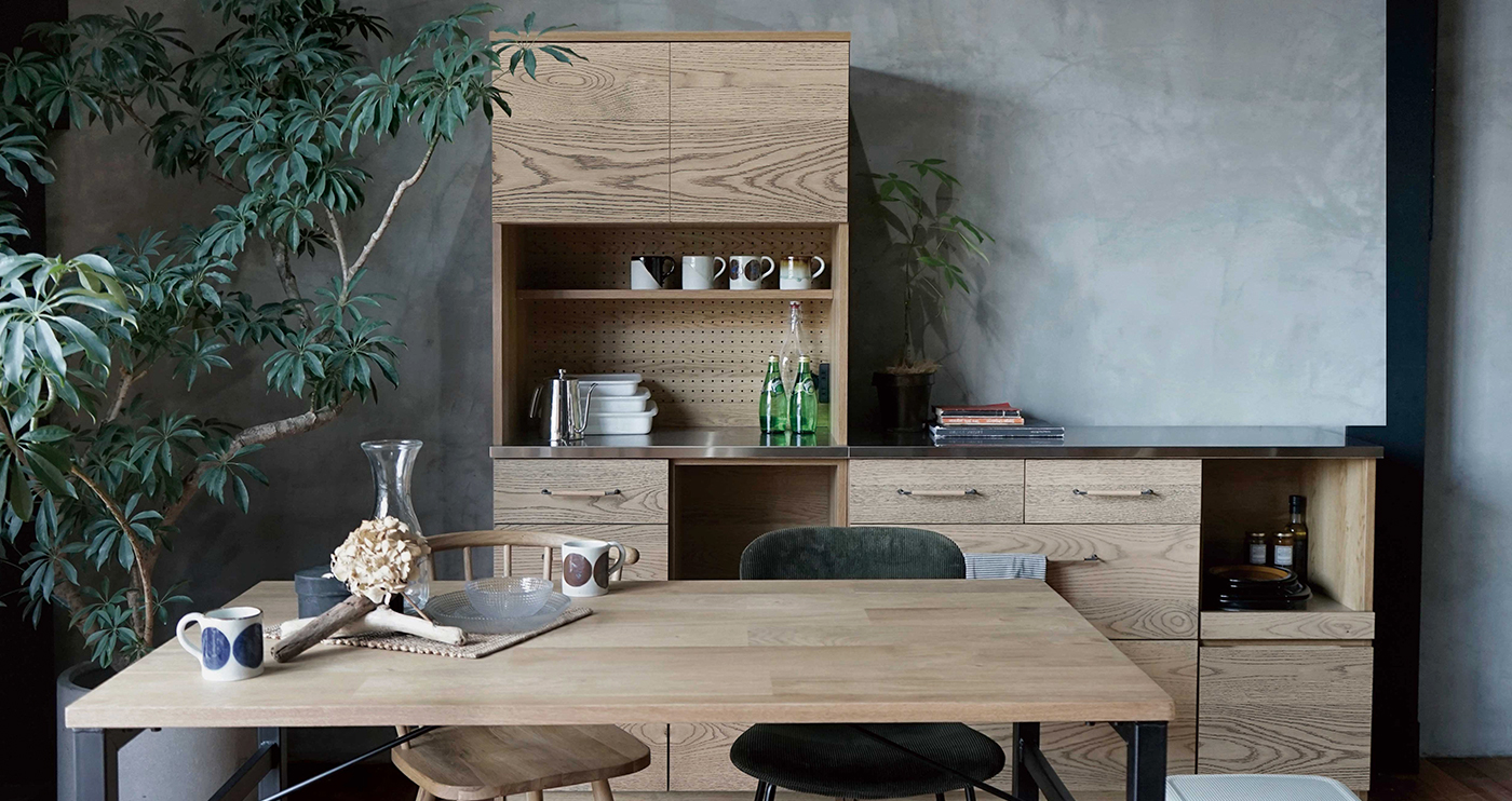 独特な中間色を実現したkamn“カム”シリーズです。 新たな新色として作り上げた色味は、ナチュラル色のテーブルにも ブラウン色のテーブルにもコーディネートできる不思議色です。 それぞれの天板には燕三条で丁寧に作られるヘアラインを入れたステンレスを使用し、 清潔感と使いやすさ、モダンさを加えてくれています。 ハンドルには、kamnシリーズ用に開発したスチール× 削り出しオーク材の オリジナルハンドルを使用しています。シンプルさとあたたかさが同居します。 国産で品質間違いなく作られたキッチンボードで ダイニング空間で新たな価値観を生み出してくれます。