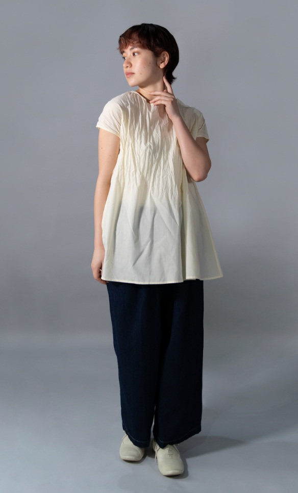 crinkle french sleeve blouse ¥10,780(税込) irregular tuck pants ¥12,980(税込)code 02