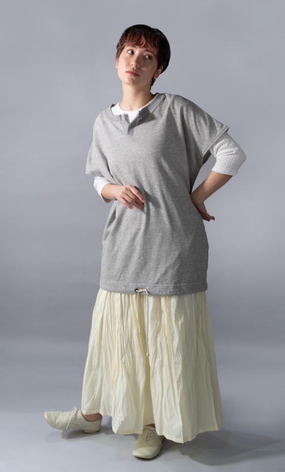 switch cloth vest ¥11,880(税込) clean my cutsew hree-quarter sleeves ¥4,180(税込) work flare skirt ¥12,980(税込)ウエスト部分がゴムになっている、フレアースカートです。