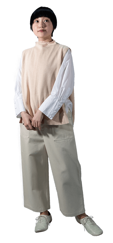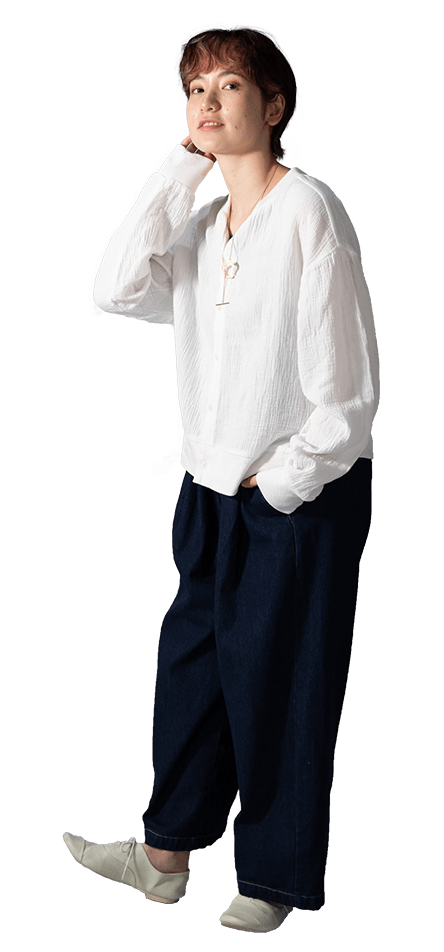 cotton gauze cardigan ¥11,000(税込) irregular tuck pants ¥12,980(税込)code 03