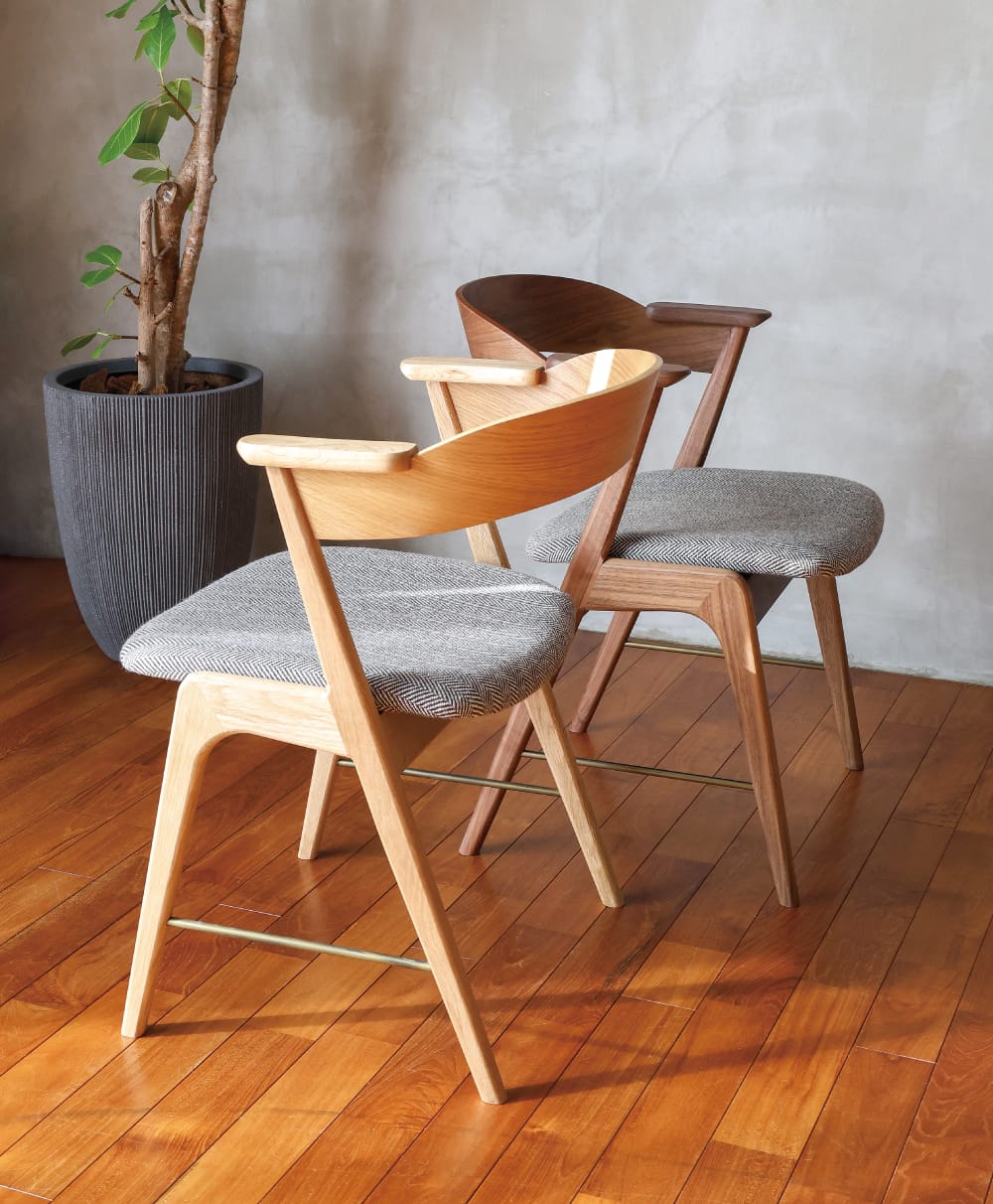 オークとウォルナットの無垢材を使用し、重厚ながらも軽快感の出ているカジュアルチェアも登場します。