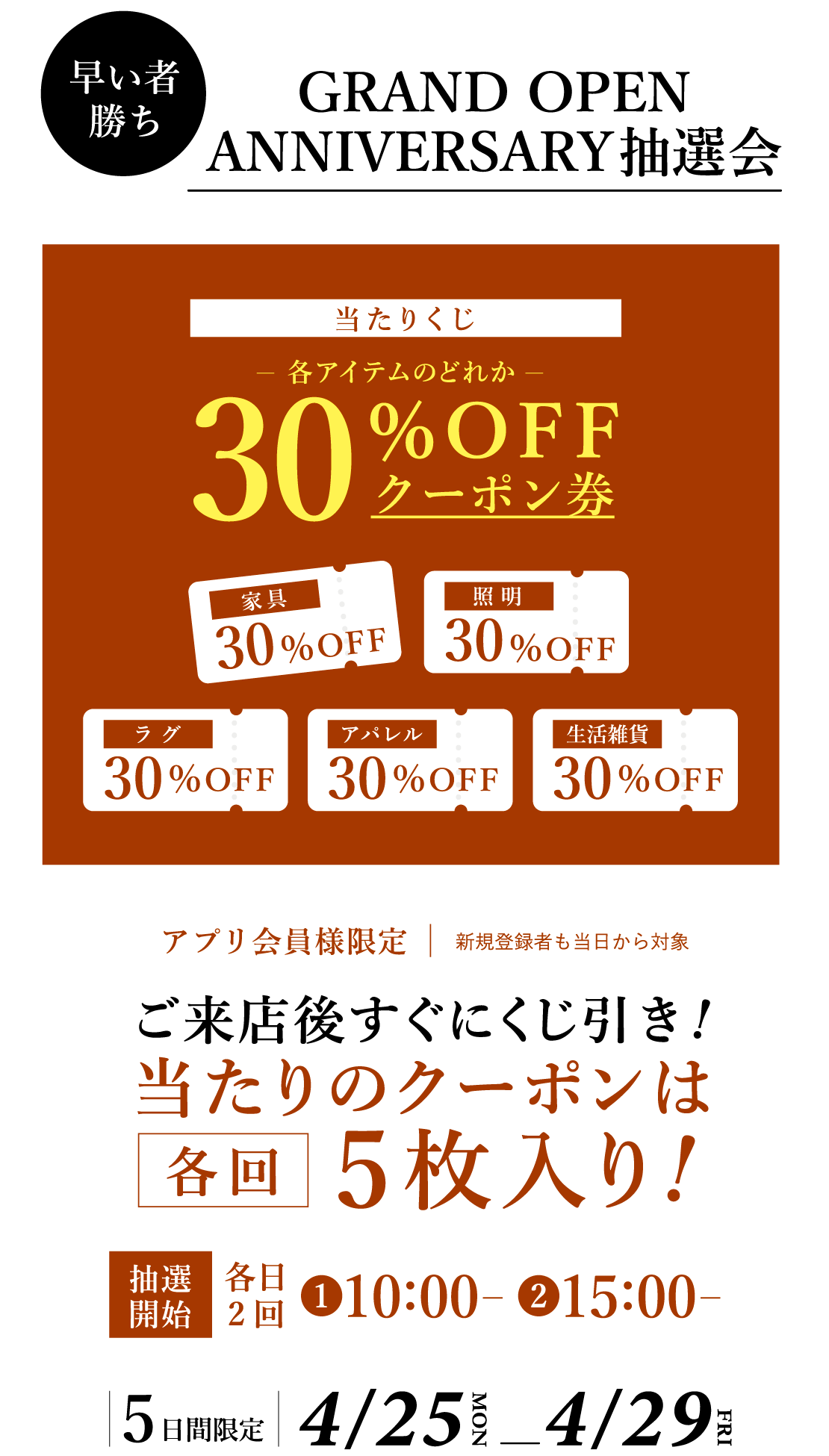 - 抽選の当たりくじ30%OFFクーポン券は、「店内全品10%OFF」との併用は不可です。